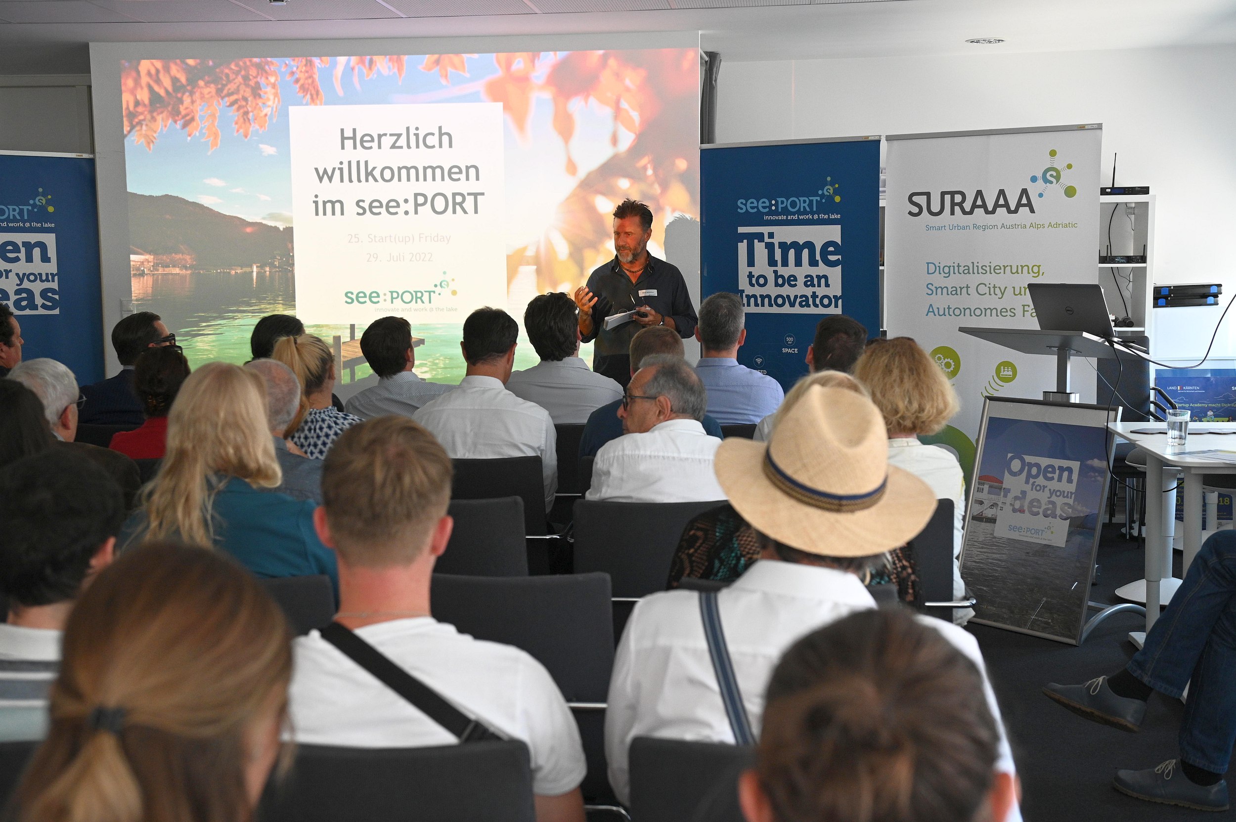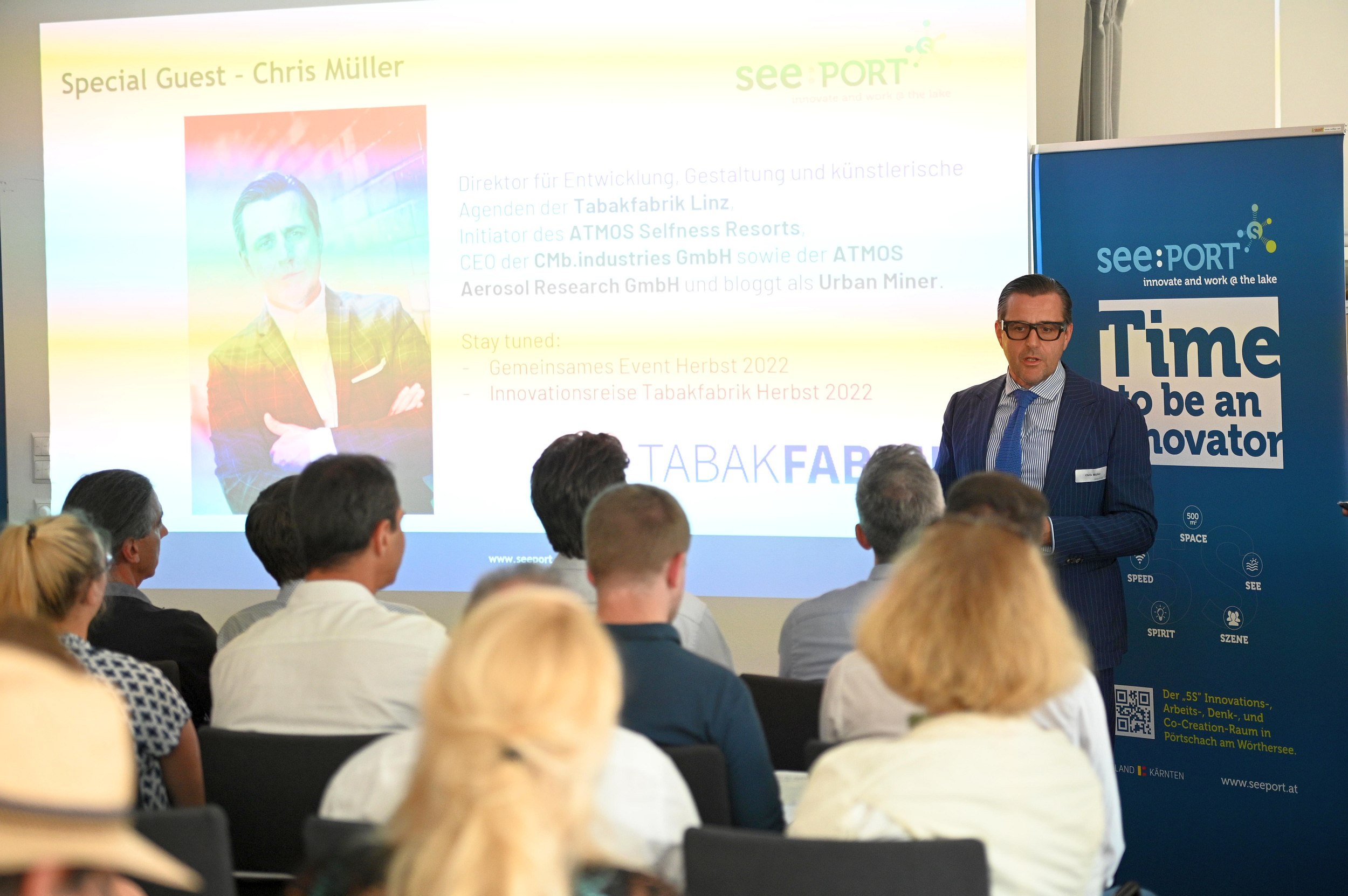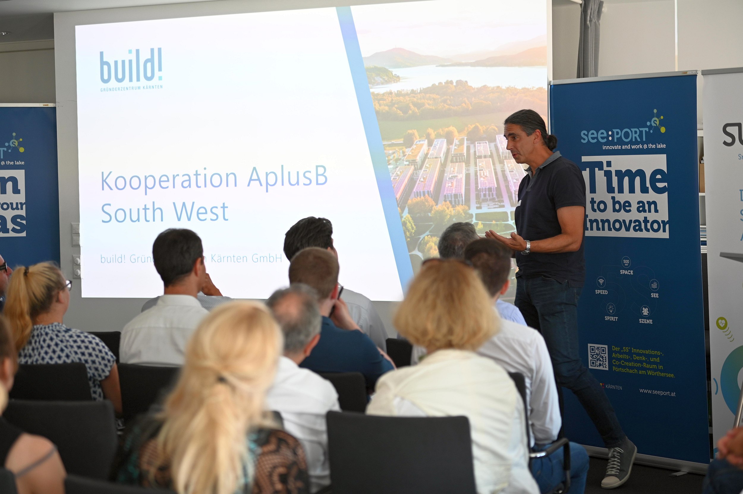 Los ging der innovative Reigen mit Chris Müller, Mastermind der Tabakfabrik Linz. Im Rahmen der Kooperation mit dem see:PORT wird Pörtschach ab sofort zum begehrten „Workation“-Hotspot der zahlreichen Tabakfabrik-Mieter. Als Kooperationspartner des Tages nutzte build! Gründerzentrum Geschäftsführer Jürgen Kopeinig den Ökosystem-Impuls, um auf die Notwendigkeit von Kooperationen zu verweisen: „Nur durch gemeinsames, konzertiertes Vorgehen kann sich in Kärnten ein Ökosystem aufbauen, das seine Strahlkraft über die Grenzen Kärntens hinaus entfaltet.“