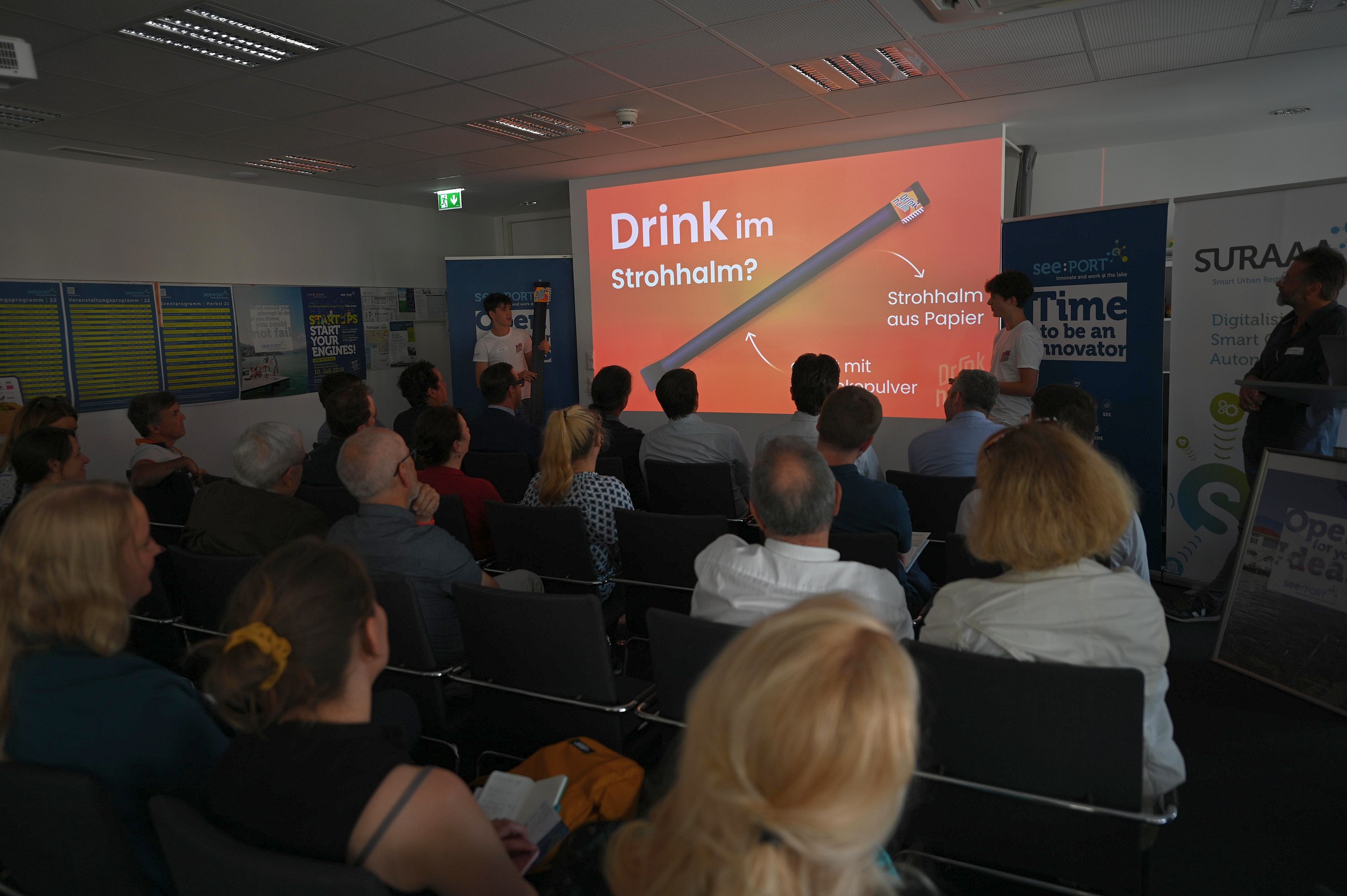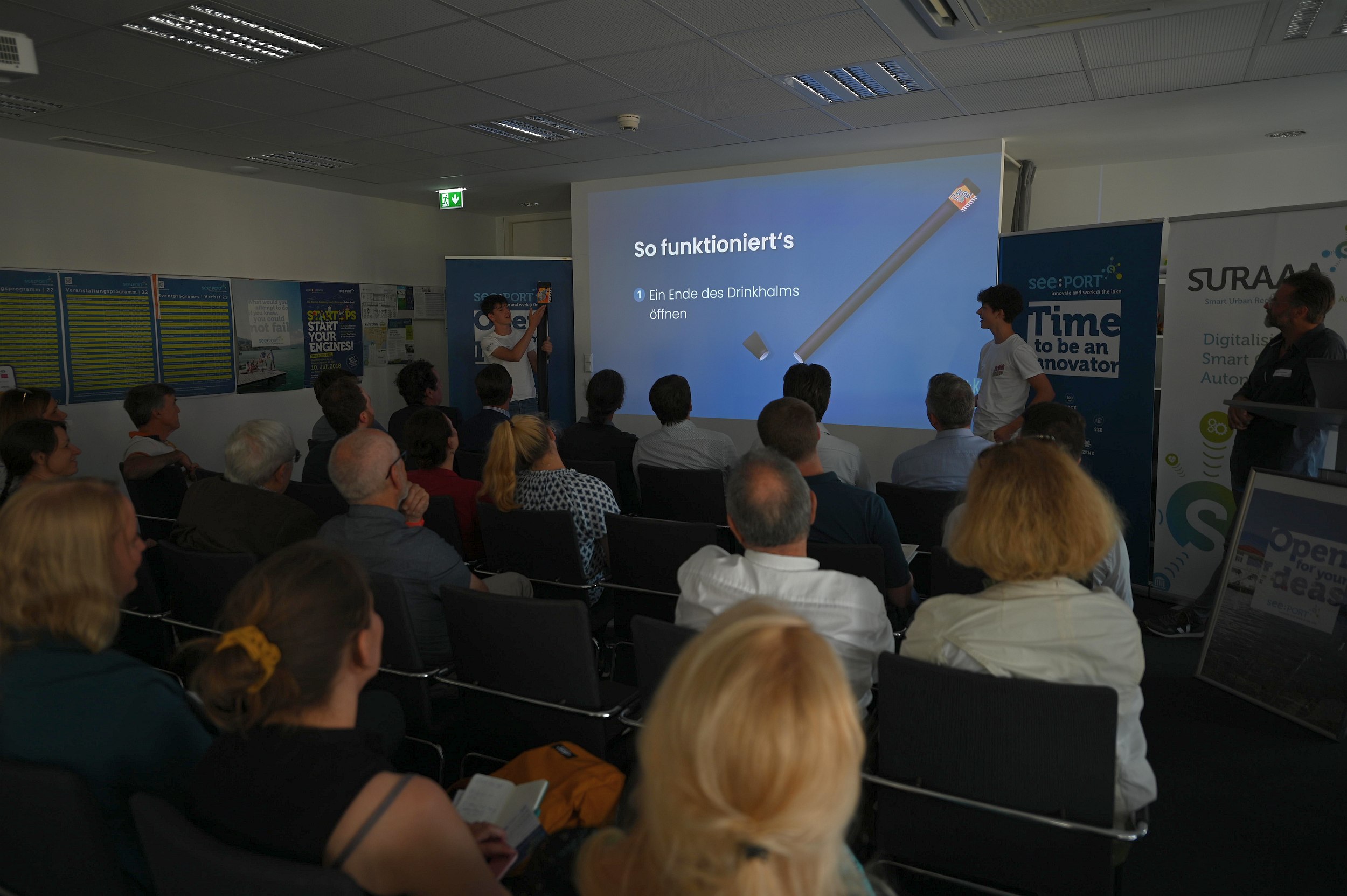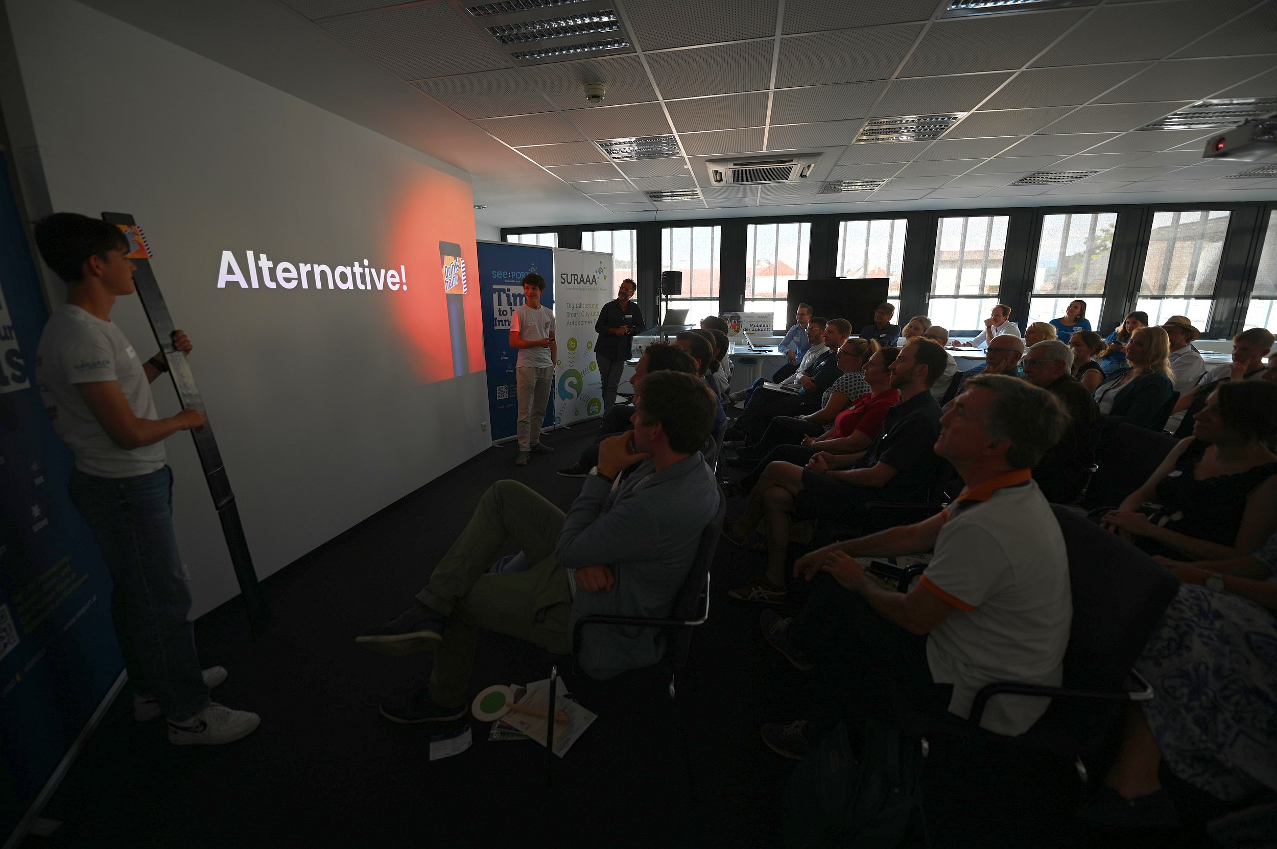 Landwirtschaftliche Innovationen, aber auch nachhaltige Energielösungen waren die Themen bei den drei Startup-Pitches: Alexander Hardt-Strehmayr, Founder von Avemoy, demonstrierte in seinem Vortrag, dass mittels einfacher Aufrüstung von Standarddrohnen erschwingliche und vollautonome Datenaufnahme inner- und außerhalb von Gebäuden bereits möglich ist. Alberto Zandara, Founder bei Saturn Systems entwickelt fortschrittliche, drahtlose Sensornetztechnologien für die Landwirtschaft, um u.a. die Nachhaltigkeit des Anbaus zu verbessern und so zur Bekämpfung des Klimawandels beizutragen. Matthias Nadrag, CEO, enixi GmbH bringt über eine intuitive App Energieerzeuger und Abnehmer in Energiegemeinschaften zusammen und ermöglicht den Direkthandel von erneuerbarer Energie. Doch den meisten Applaus ernteten die jüngsten Bühnengäste: Luca und Marc von „Drinkhalm“, eine Junior Company, welche von SchülerInnen des BG/BRG Mössinger Klagenfurt, betrieben wird. Beim größten europäischen Jungunternehmer-Wettbewerb, dem sogenannten „JA Europe Company of the Year Award“, sicherten sie sich im estnischen Tallinn den großartigen zweiten Platz. Beim Start(up) Friday präsentierten sie ihre Idee nicht nur auf der Bühne, sondern überzeugten auch beim Netzwerken von der erfrischenden Kraft ihrer neuartigen Produktidee.