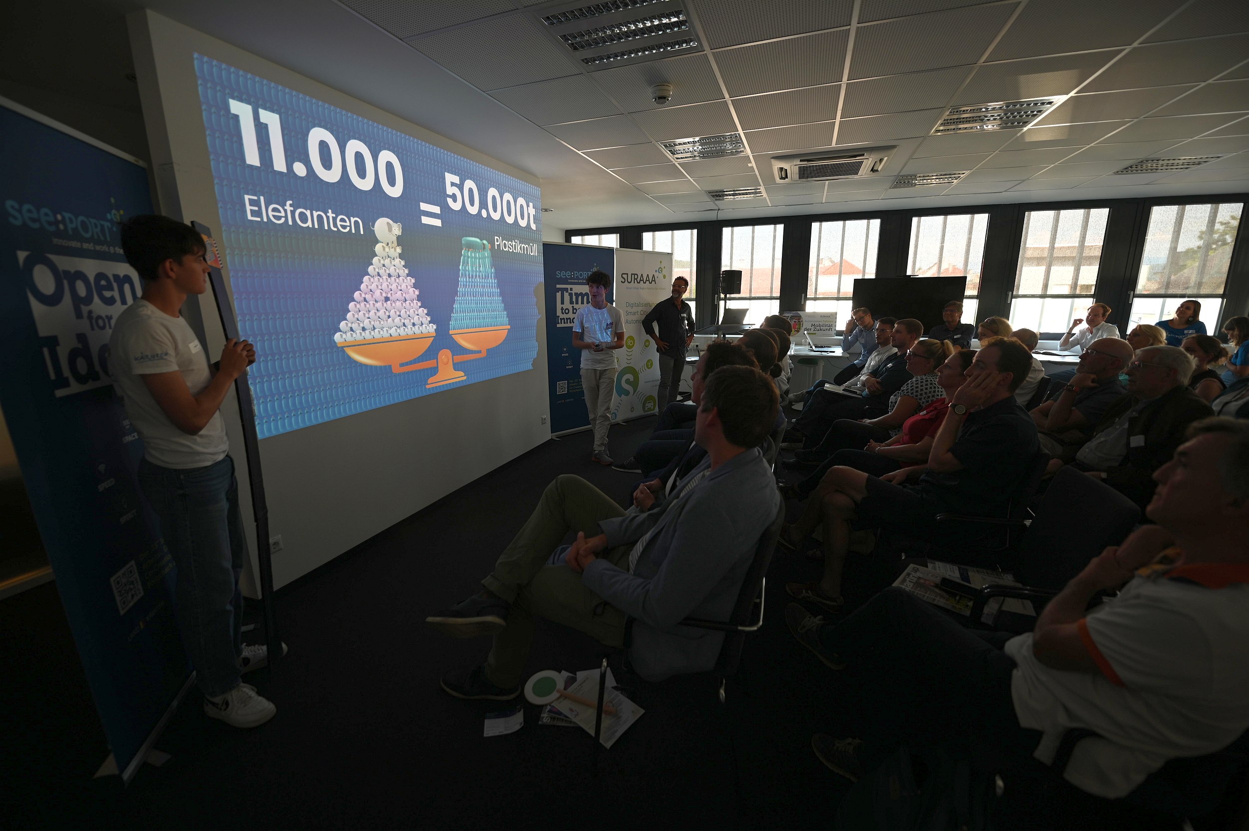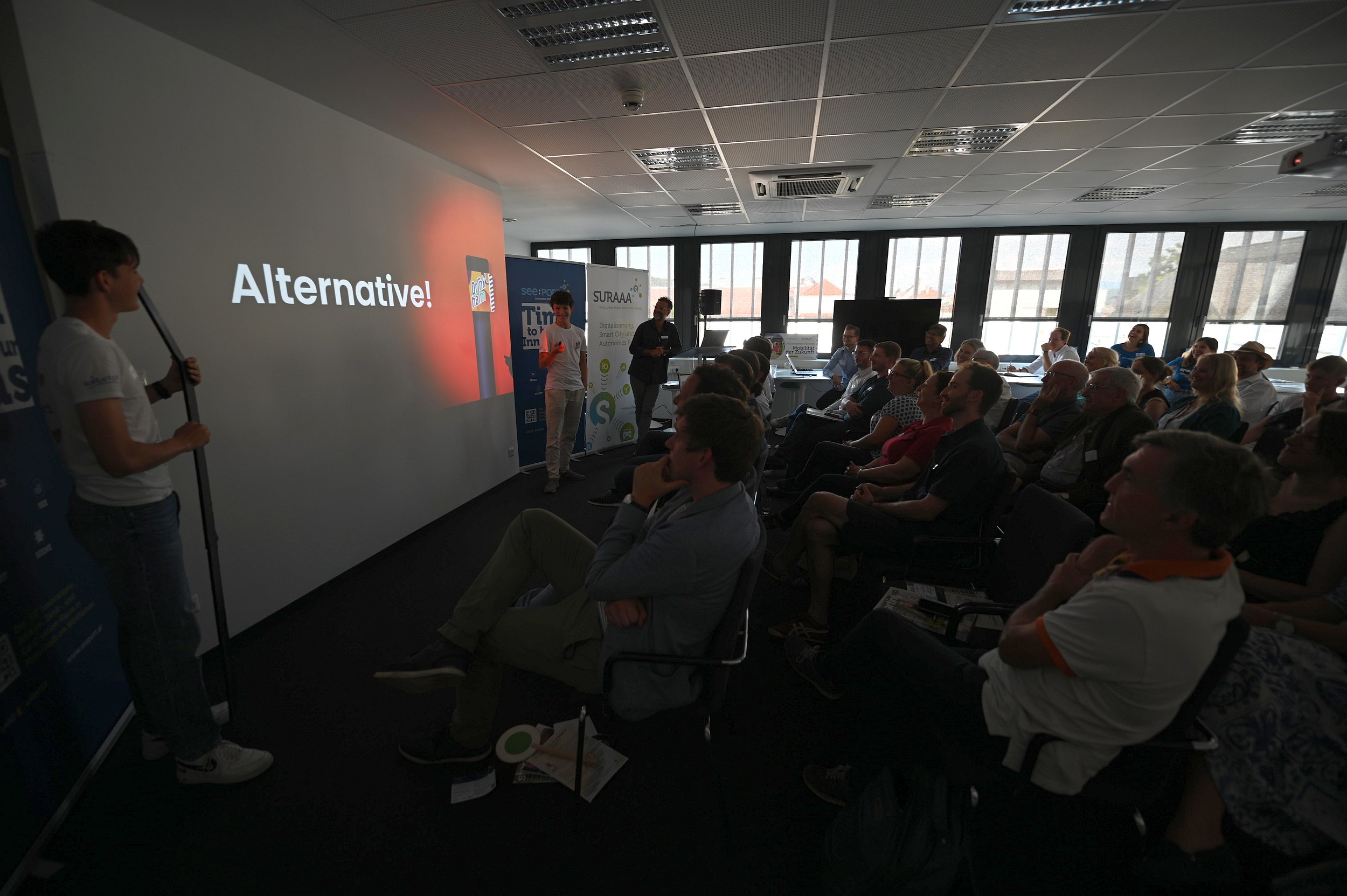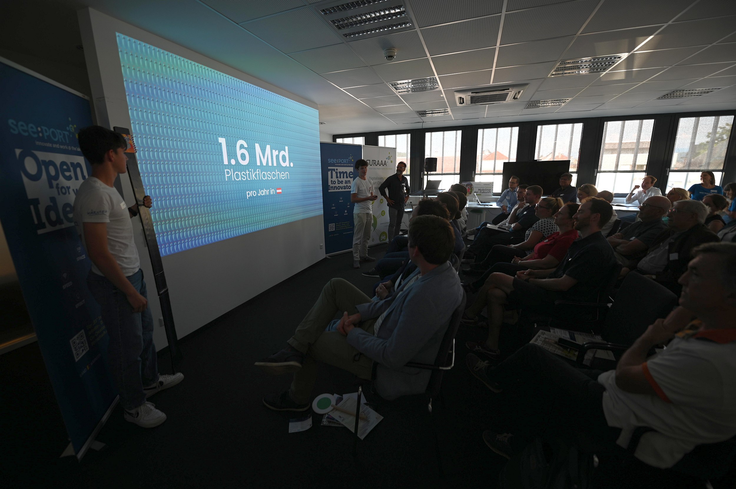 Landwirtschaftliche Innovationen, aber auch nachhaltige Energielösungen waren die Themen bei den drei Startup-Pitches: Alexander Hardt-Strehmayr, Founder von Avemoy, demonstrierte in seinem Vortrag, dass mittels einfacher Aufrüstung von Standarddrohnen erschwingliche und vollautonome Datenaufnahme inner- und außerhalb von Gebäuden bereits möglich ist. Alberto Zandara, Founder bei Saturn Systems entwickelt fortschrittliche, drahtlose Sensornetztechnologien für die Landwirtschaft, um u.a. die Nachhaltigkeit des Anbaus zu verbessern und so zur Bekämpfung des Klimawandels beizutragen. Matthias Nadrag, CEO, enixi GmbH bringt über eine intuitive App Energieerzeuger und Abnehmer in Energiegemeinschaften zusammen und ermöglicht den Direkthandel von erneuerbarer Energie. Doch den meisten Applaus ernteten die jüngsten Bühnengäste: Luca und Marc von „Drinkhalm“, eine Junior Company, welche von SchülerInnen des BG/BRG Mössinger Klagenfurt, betrieben wird. Beim größten europäischen Jungunternehmer-Wettbewerb, dem sogenannten „JA Europe Company of the Year Award“, sicherten sie sich im estnischen Tallinn den großartigen zweiten Platz. Beim Start(up) Friday präsentierten sie ihre Idee nicht nur auf der Bühne, sondern überzeugten auch beim Netzwerken von der erfrischenden Kraft ihrer neuartigen Produktidee.