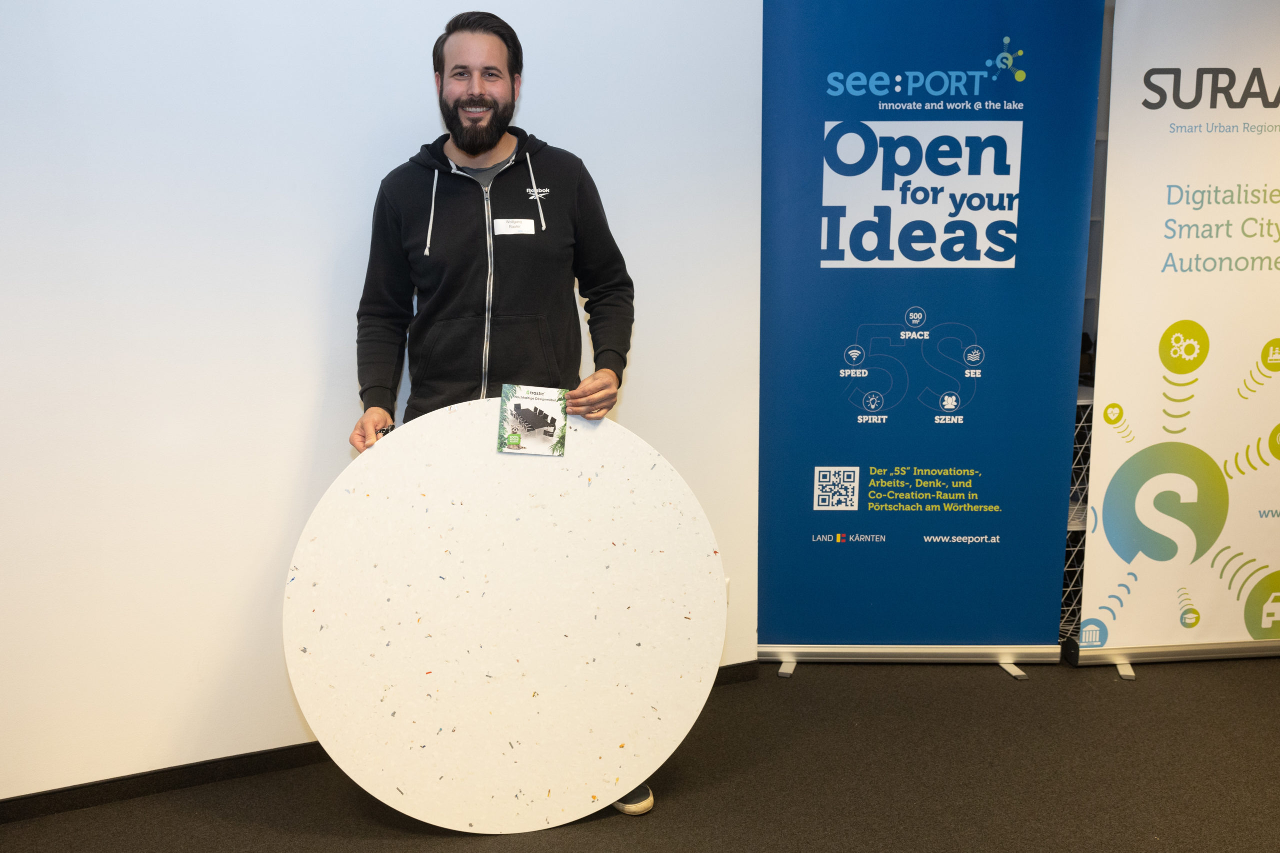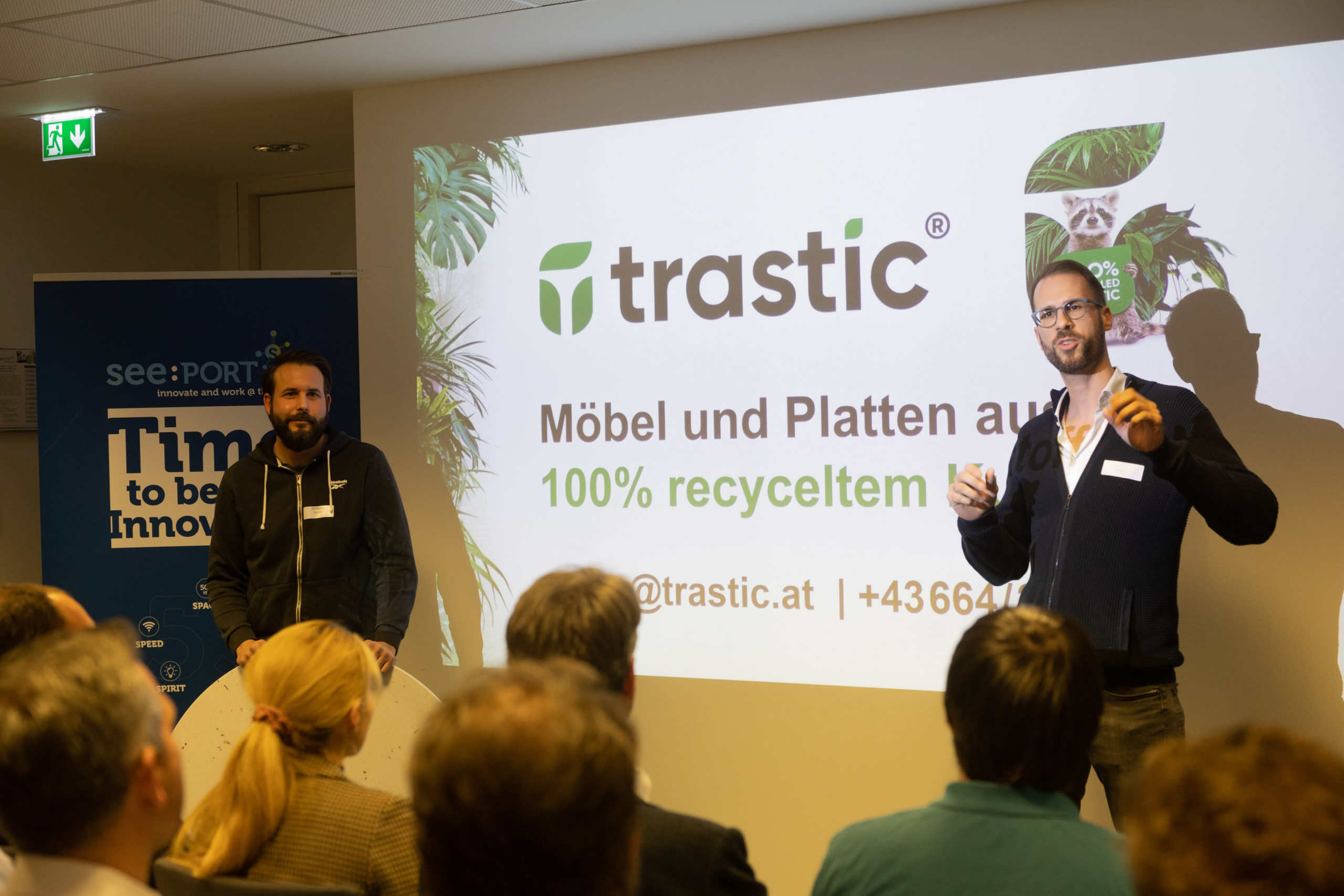 Daniel Schwabl, CEO der CIRCULYZER GmbH aus Leoben erklärten, wie man mit einem Zentrifugalscheider durch Wasserwirbel Plastikteilchen aus Restmüll absondern kann. Die beiden Kärntner Arno Trinkl und Wolfgang Rauter, CEOs der TRASTIC GmbH, brachten ihr Produkt gleich mit und zeigten eine Tischplatte, die ausschließlich aus recycelten Joghurtbechern hergestellt wird.