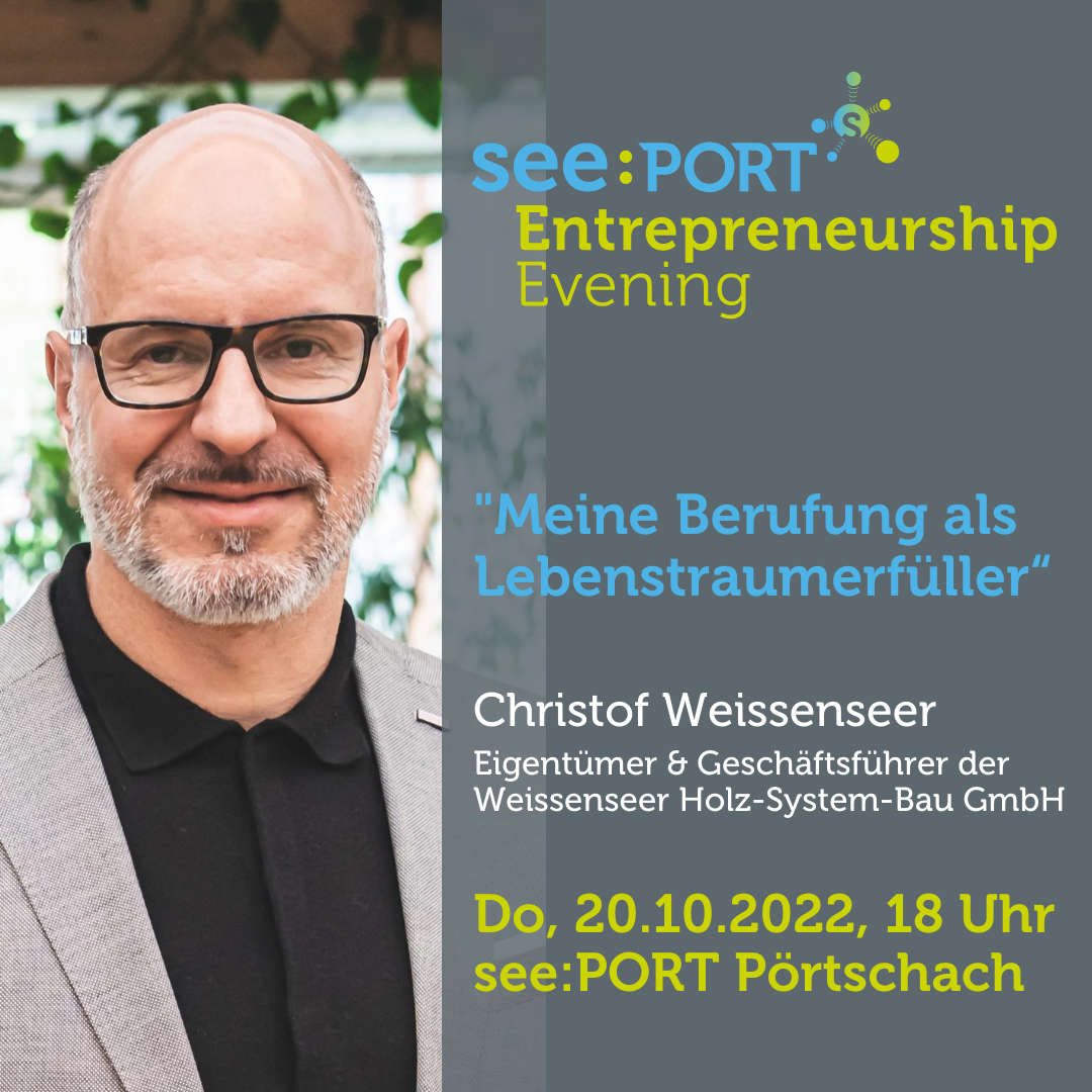 Wir freuen uns, Christof Weissenseer, Eigentümer & Geschäftsführer der Weissenseer Holz-System-Bau GmbH, als Speaker für den 21. Entrepreneurship Evening am 20. Oktober 2022, begrüßen zu dürfen.